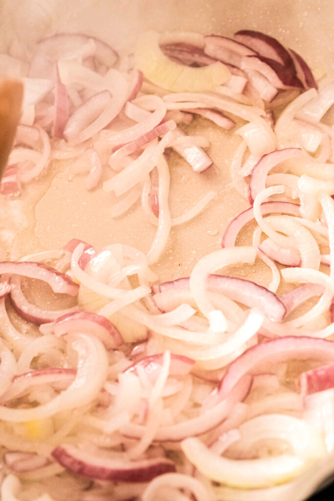 - Stir fry sliced onion until they are wilted and slightly yellow (6-7 minutes).