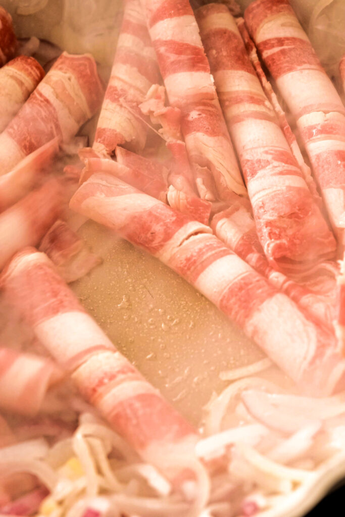 The answer, anything! You can put anything in this dish. The one thing I would advise is that choose proteins and veggies that can be cooked through easily. This way, it cooks faster in one pot and also reduce the possibility of burning your food. I like thinly sliced beef brisket and bean sprouts because they could be cooked really easily.