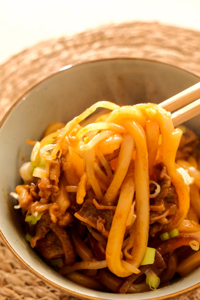 - Flip the udon to let it get covered with the sauce. Simmer for another 5 minutes. Check to see to make sure it’s not burnt at the bottom.