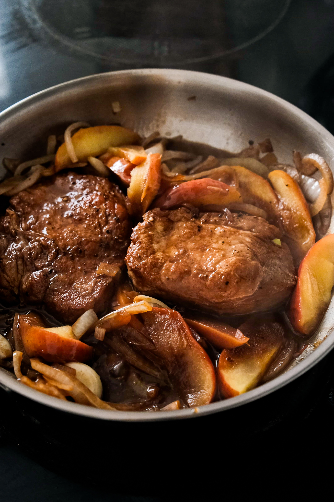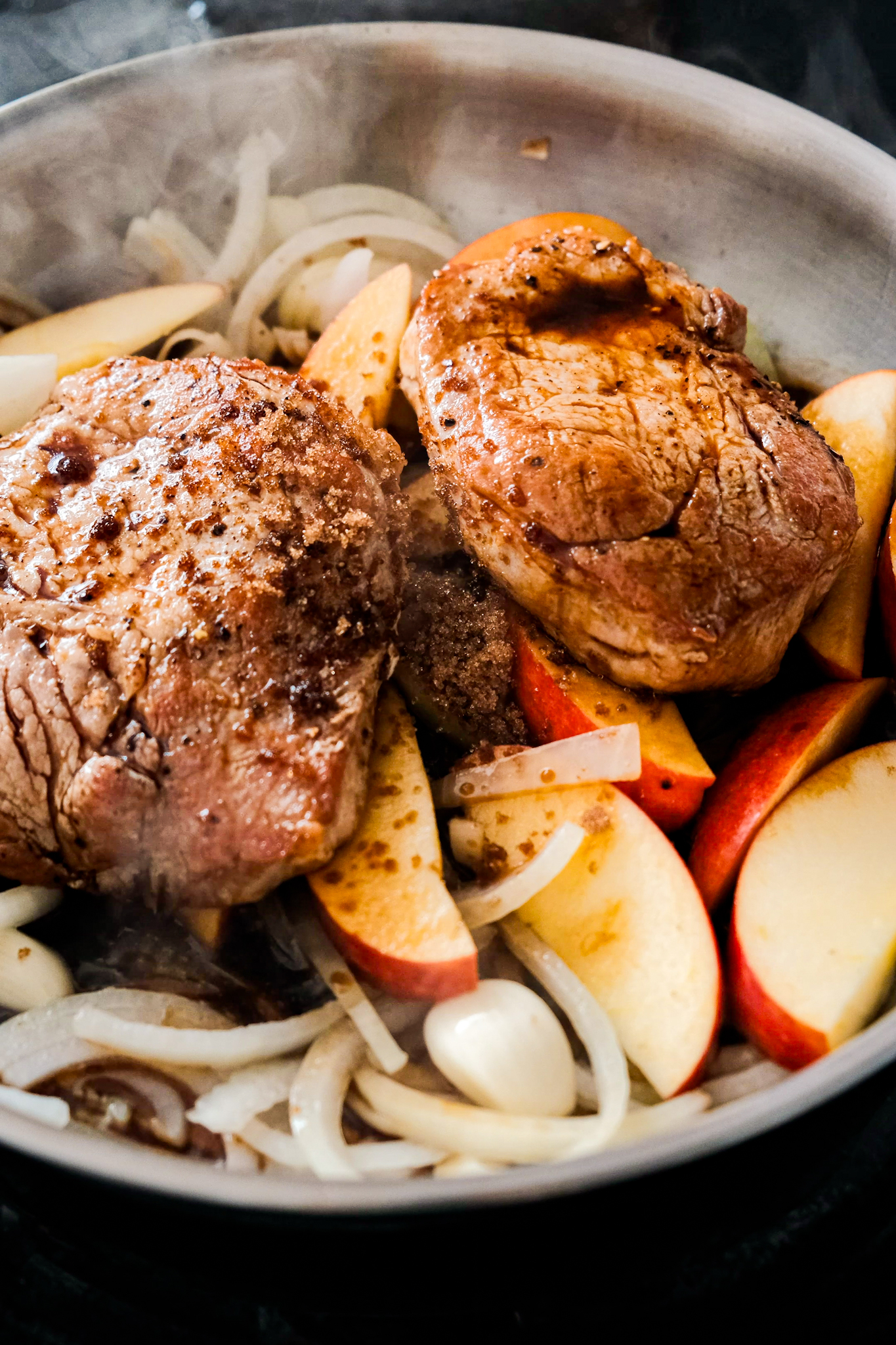 10. Add in the apple, cook for about 1 minute, add the pork chops back in.