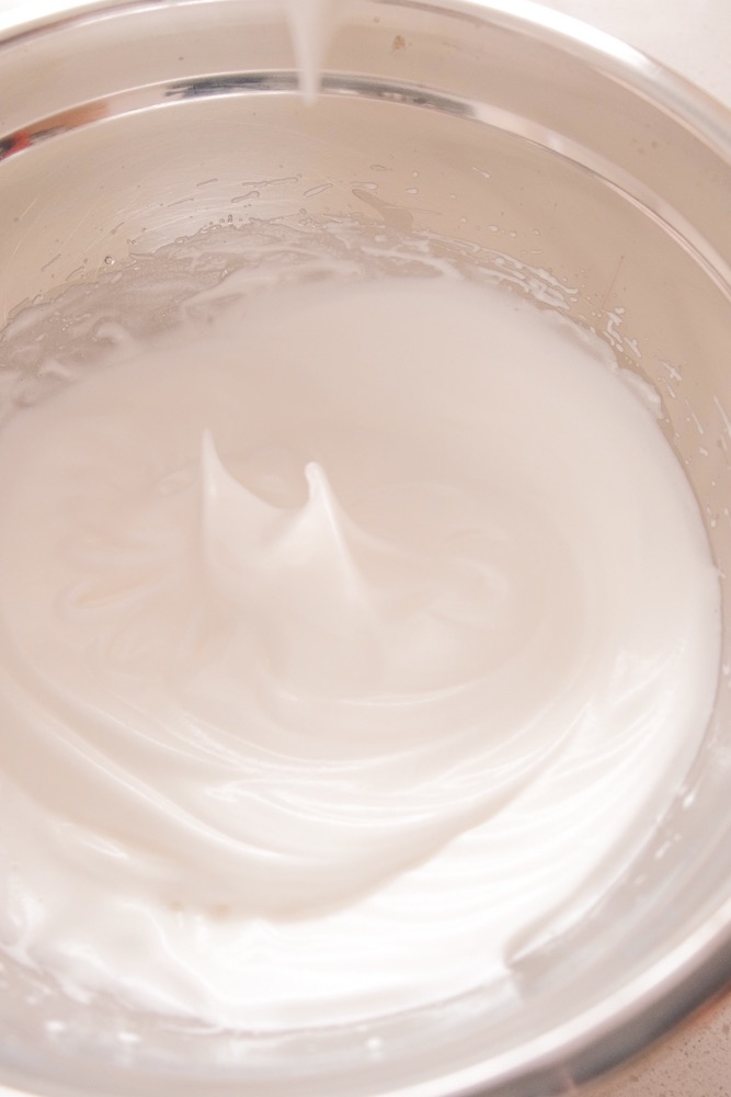 • Set aside the mixture. In a different bowl, add a few drops of lemon juice or white vinegar to the egg white. Add in sugar and whip until when you lift up whisk it When you lift up the whisk there should be a slight curve to the tip.