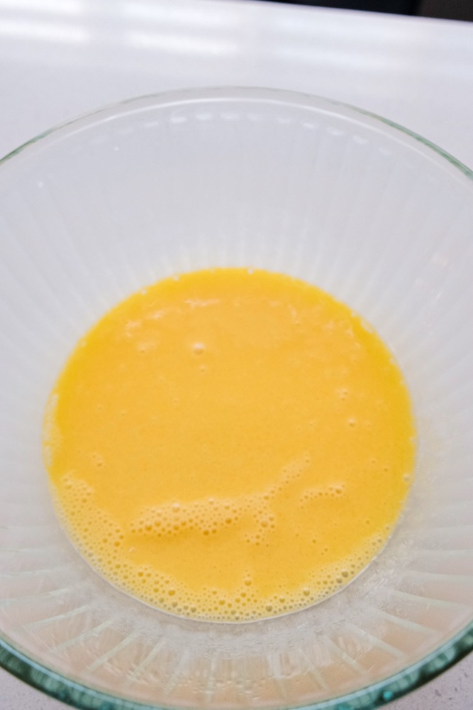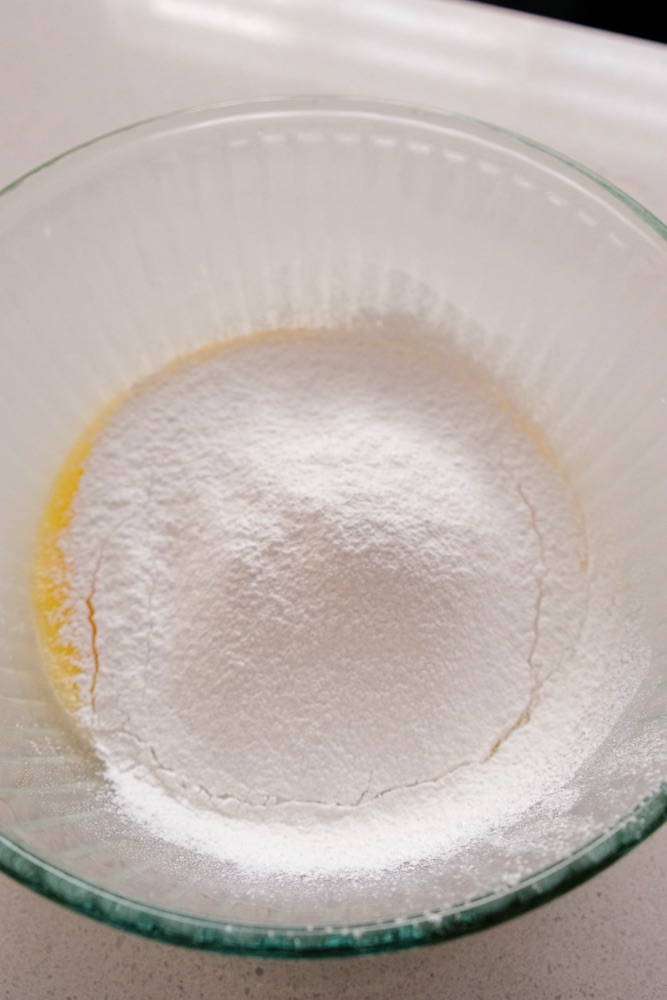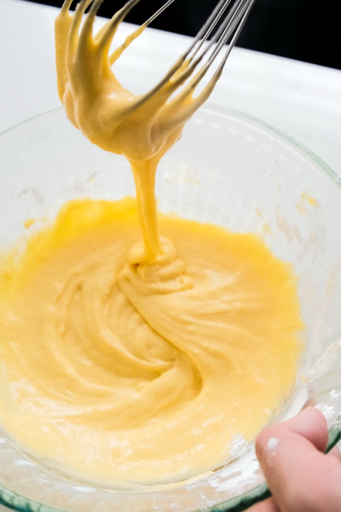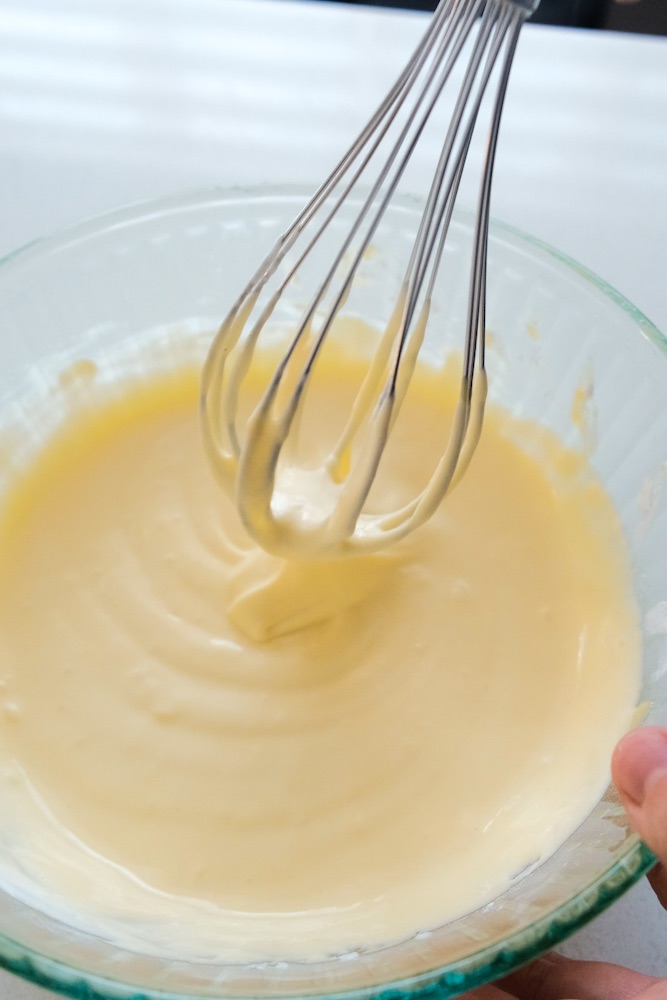 • Whisk 1/2 of egg white into your egg yolk mixture. Then add the egg yolk mixture into the egg whites. Fold until it’s fully incorporated (no egg whites shown through).