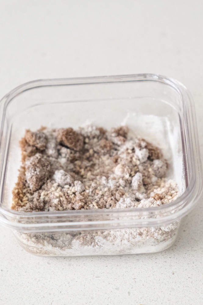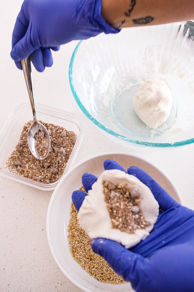 - Make your filling by combining brown sugar, roasted white sesame seeds and all purpose flour