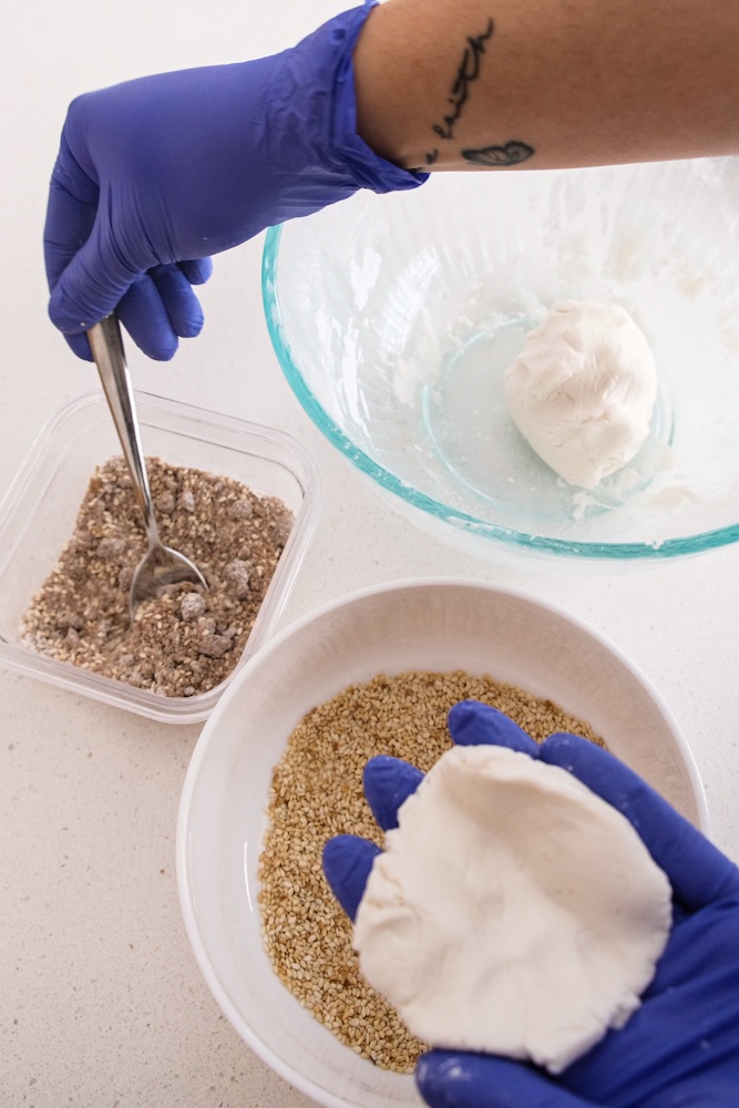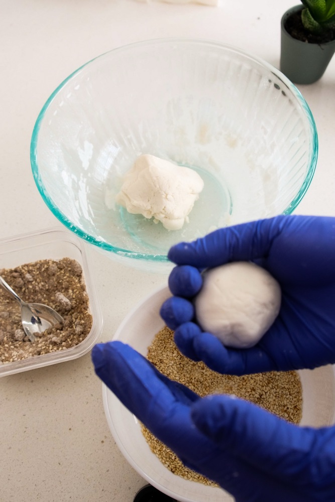 - Spray some water and roll into the white sesame seeds