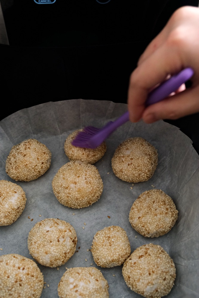 - Place the sesame mochi balls into the air fryer
