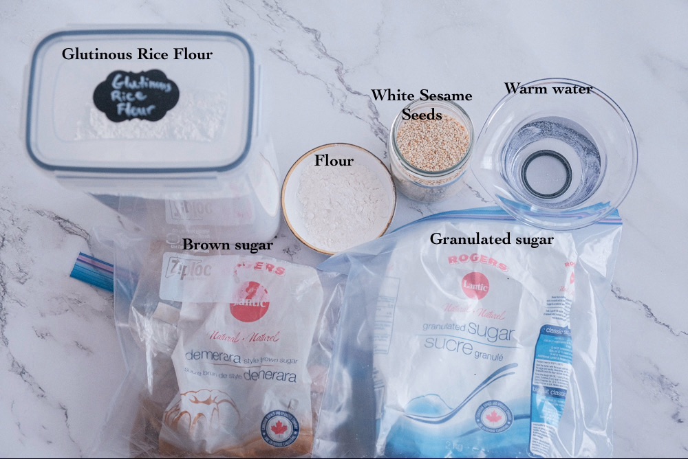 This recipe only requires 4 ingredients to make the sesame mochi balls. Depending on what your filling will be, you can purchase some pre-made filling like red bean paste. For this recipe, Iโm making a brown sugar filling with 3 ingredients only.