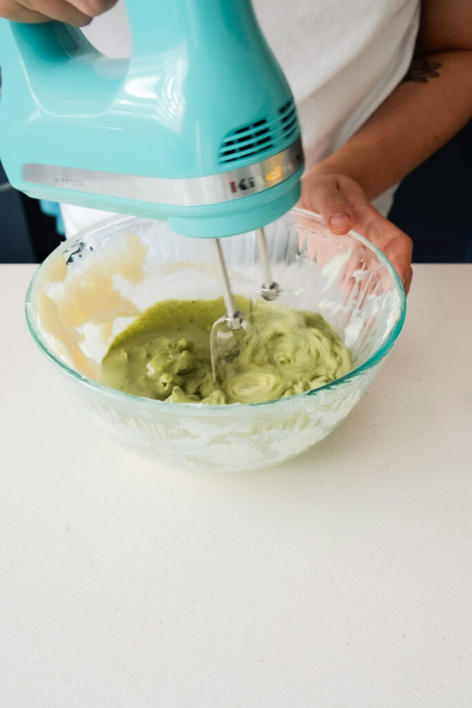 - Pour the matcha cream into cream cheese. Use a hand mixer to mix together.