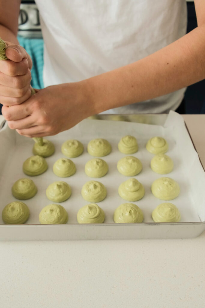 - Pipe onto a baking tray about 1 in round disc (30g)