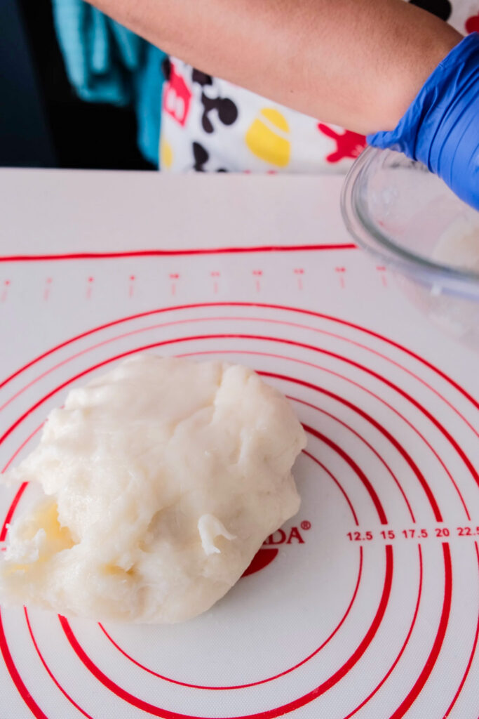 - Wear gloves to prevent sticking and protect from heat. Knead the dough until you can stretch the dough without breaking. This will help the skin stay soft and easier to wrap the matcha cream filling.